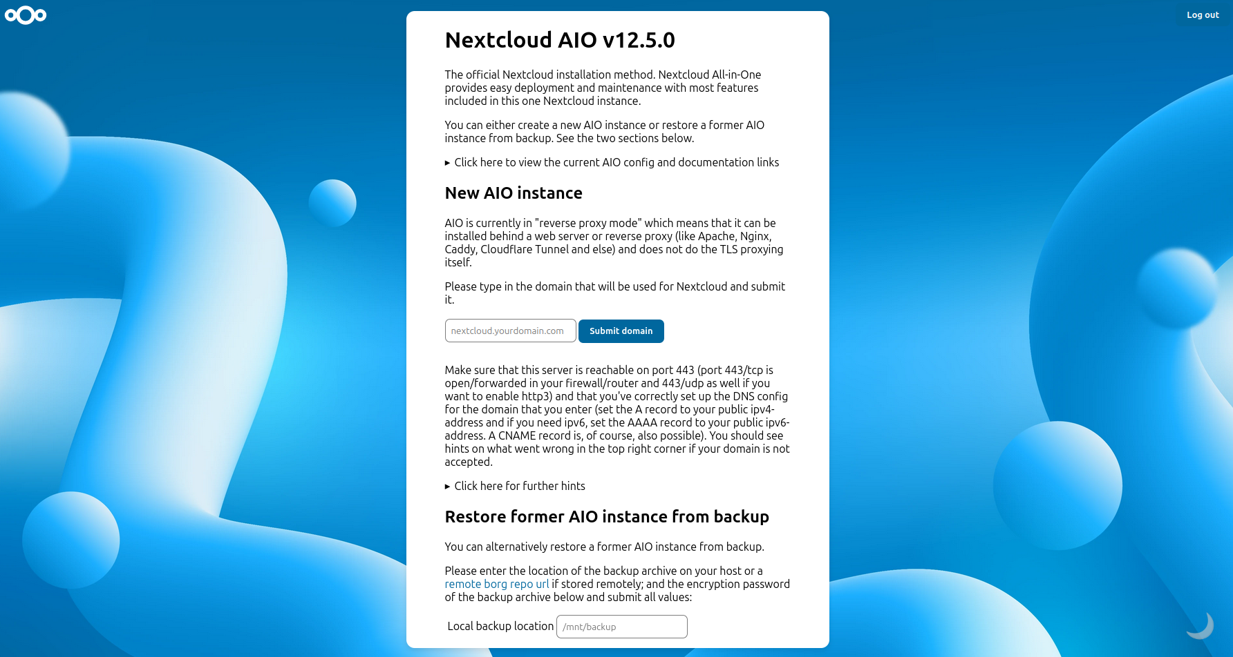 Starting using Nextcloud-AIO: customization and finalizing setup