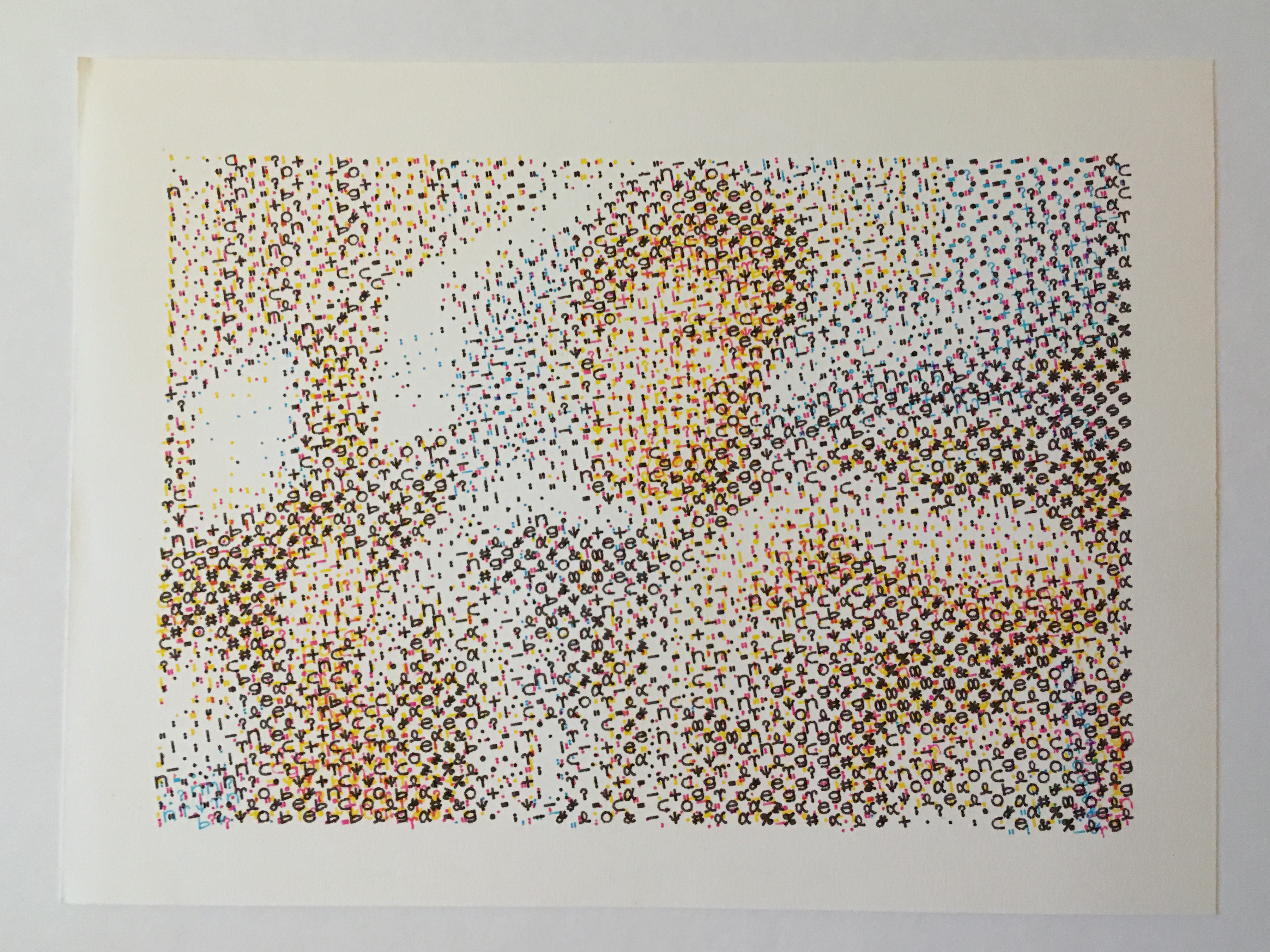 In halftoning, the screen resolution is coarser than the input image resolution. Thus, each dot of the screen covers an area including several pixels of the image. The color intensity associated with each dot is computed by averaging the values of the pixels it covers. Finally, the shapes of the dots are drawn, or saved to a vector graphics file to be drawn later. To first test the process with simple shapes, I simply used circles of size proportional to the dot’s color intensity. Later I used more complex shapes as described below.