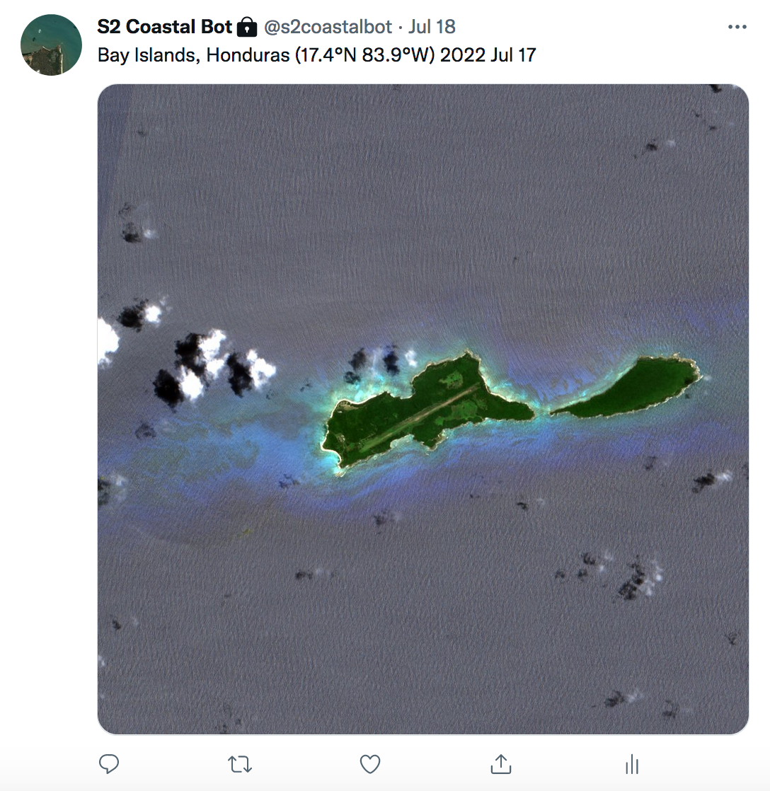In my work as a remote-sensing engineer monitoring the coastal environment, I often come across beautiful scenes. I had the idea of sharing this by creating a twitter bot that would randomly post snapshots of satellite acquisitions anywhere in the world (I moved it to Mastodon since). I took inspiration from already existing twitter bots. But for this idea, I wanted to restrict the image selection to recent acquisitions covering some coastline with minimum cloud cover.